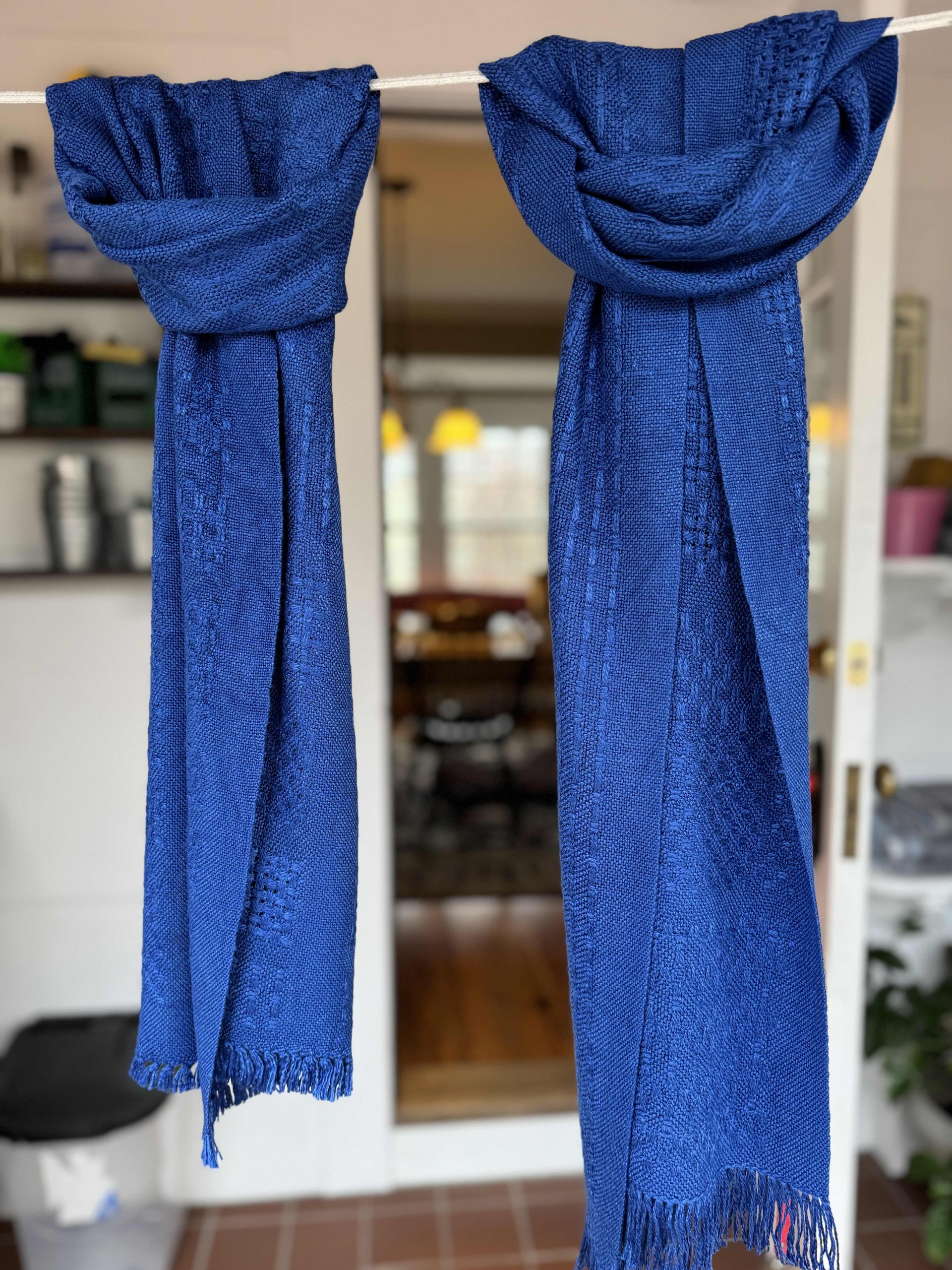 Huck lace bamboo scarves in soft navy bamboo. Woven especially for four season wear. Air conditioned restaurants, light, breezy fall days and spring temperature changes, and keeping the chill away under your coat on cold winter days – this beautiful scarf will serve you all year long. 14” x 65” with fringe, the weave pattern is fun and interesting. And the drape is lovely. Makes an excellent birthday or holiday gift for your best friend or favorite family member. Or something nice for yourself!