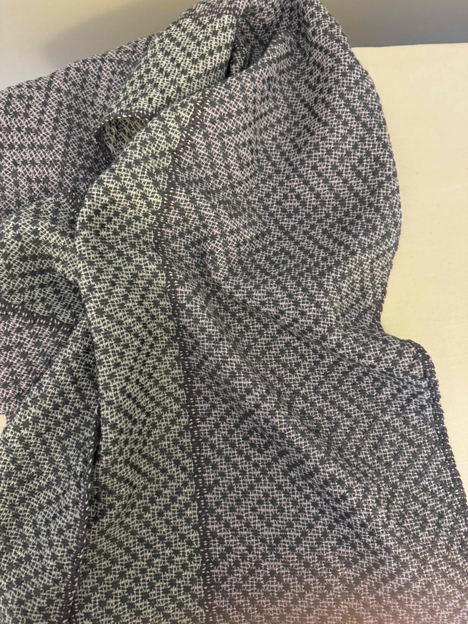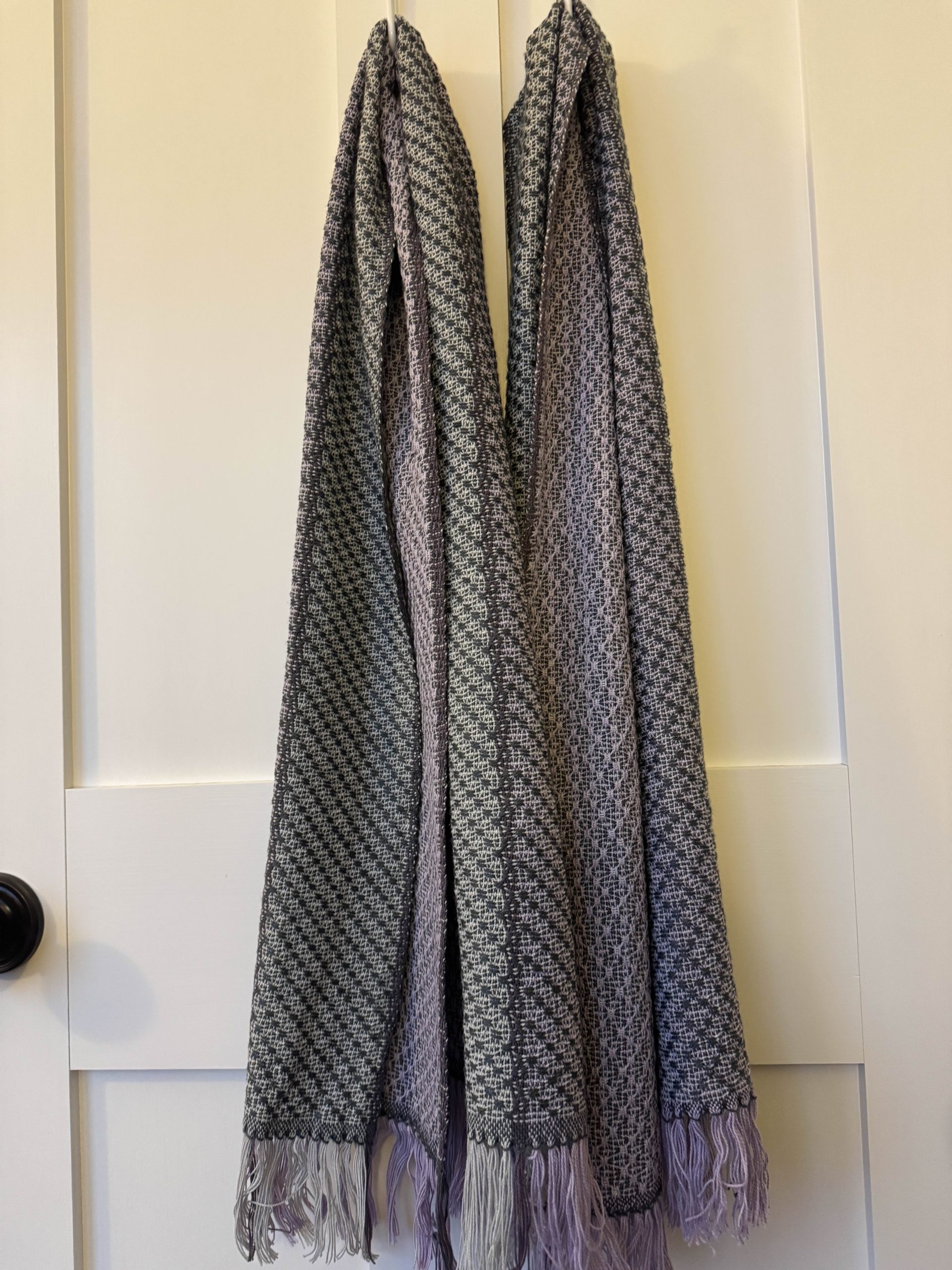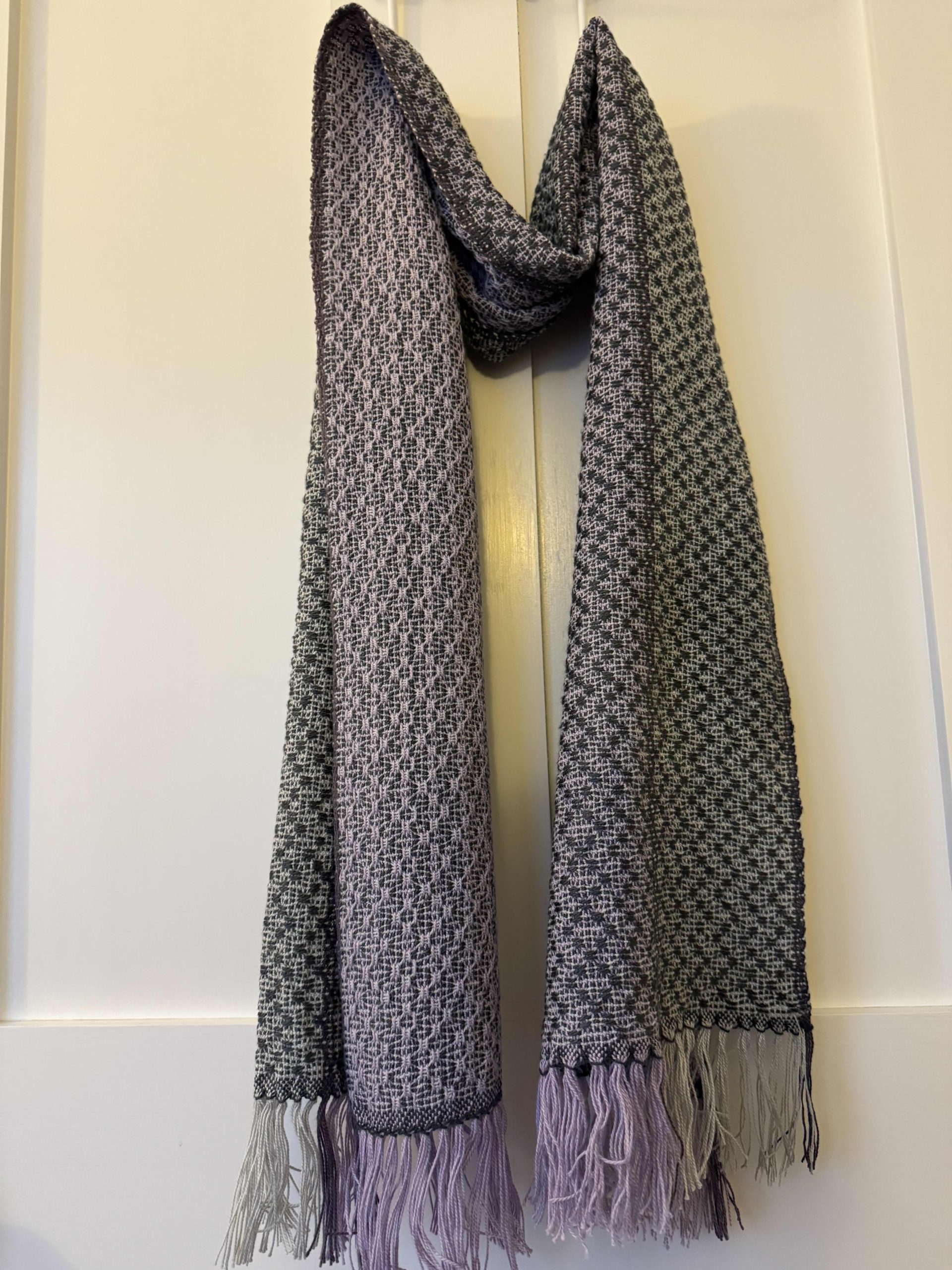 Woven in Charcoal Bamboo with light gray and light plum cotton warp, these scarves are the perfect 4 season accessory, going with you from the breezy cool days of spring and fall to the air conditioned chill of summer and wrapped under your jacket to keep the cold from swirling down your neck in winter. The scarves are 14” wide and 65” long so you can wrap them easily in many different ways. A beautiful addition to your wardrobe, and wearable in formal and casual settings.